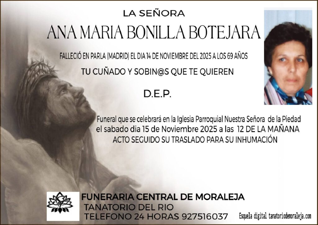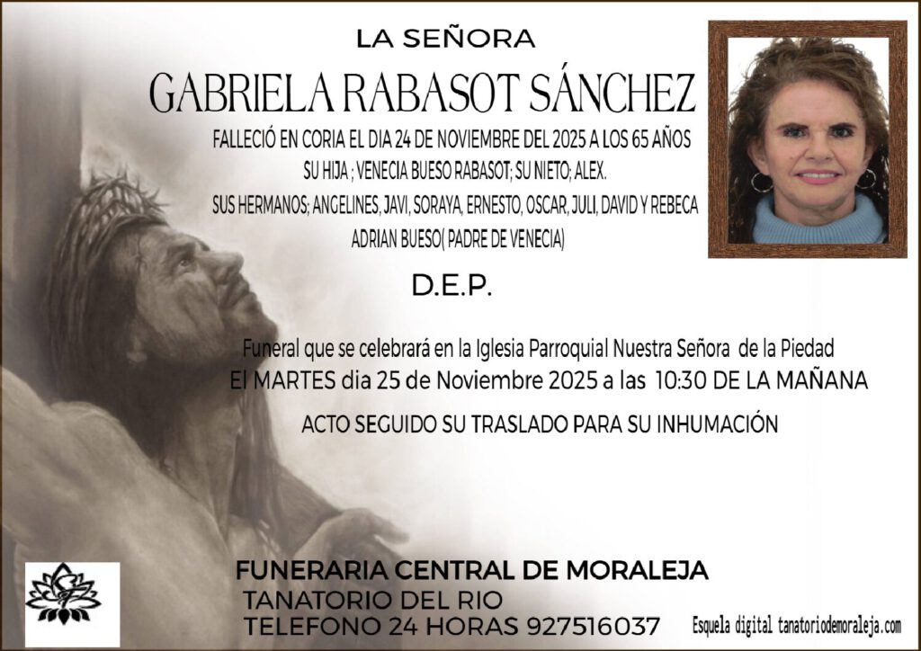 FALLECIO EN PARLA MADRID EL DIA 14 DE NOVIMBRE DEL 2025 A LOS 69 AÑOS DE EDAD D.E.P TU CUÑADO Y SOBRINAS QUE TE QUIEREN FUNERAL QUE SE CELEBRARÁ EN LA IGLESIA PARROQUIAL NUESTRA SEÑORA DE LA PIEDAD DE MORALEJA EL DIA 15 DE NOVIEMBRE, SABADO A LAS 12 DE LA MAÑANA ACTO SEGUIDO […]