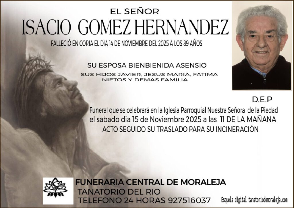 FALLECIÓ EN CORIA EL DIA 14 DE NOVIEMBRE DEL 2025 A LOS 89 AÑOS DE EDAD D.E.P SU ESPOSA DÑA. BIENVENIDA ASENSIO, SUS HIJOS JAVIER, JESUS MARIA, Y FÁTIMA HIJOS POLITICOS NIETOS Y DEMAS FAMILIA FUNERAL QUE CELEBRARÁ EN LA IGLESIA PARROQUIAL NUESTRA SEÑORA DE LA PIEDAD DE MORALEJA EL SABADO DIA 15 DE […]