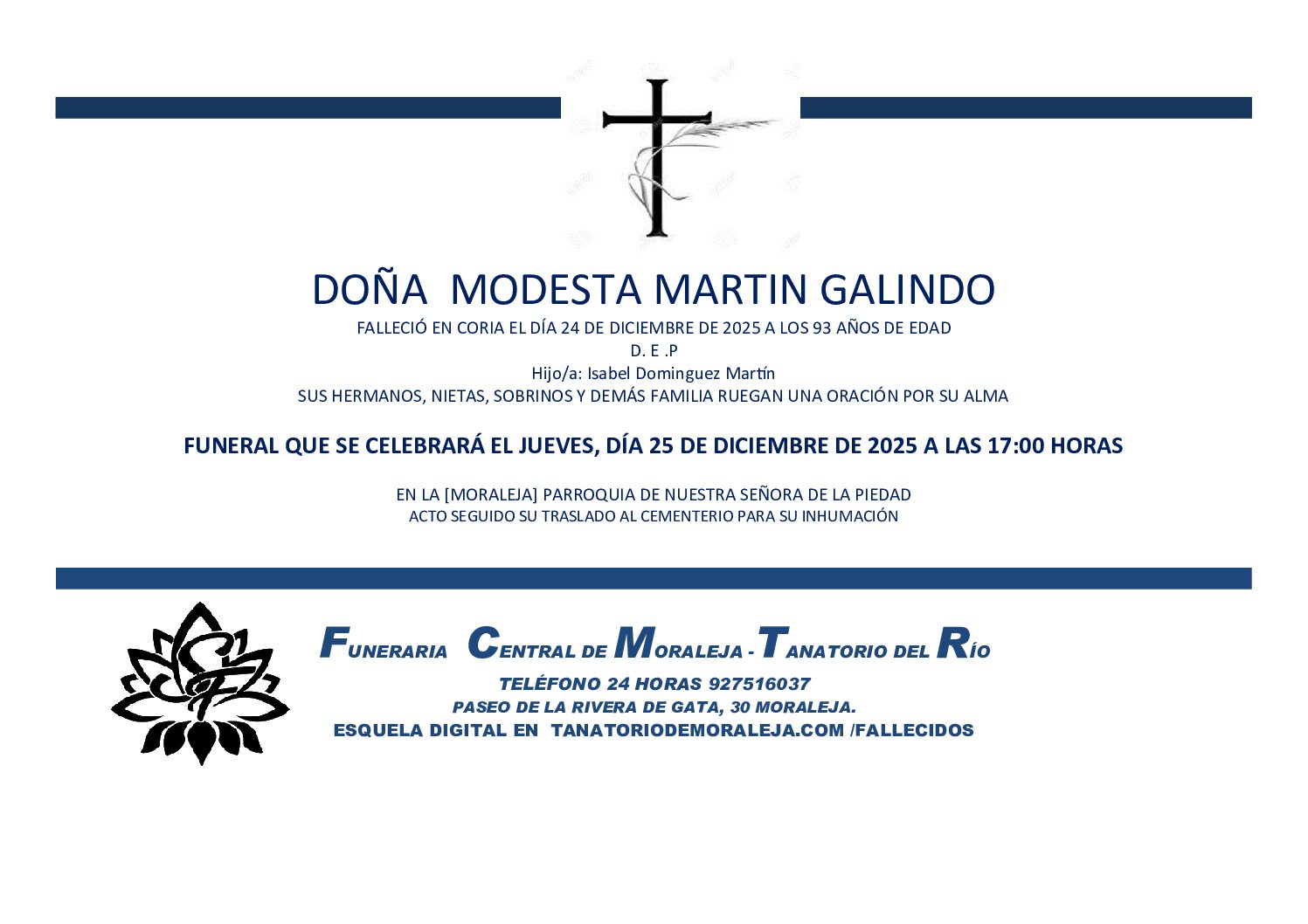 FUNERAL QUE SE CELEBRARÁ EL JUEVES, DÍA 25 DE DICIEMBRE DE 2025 A LAS 17:00 HORAS