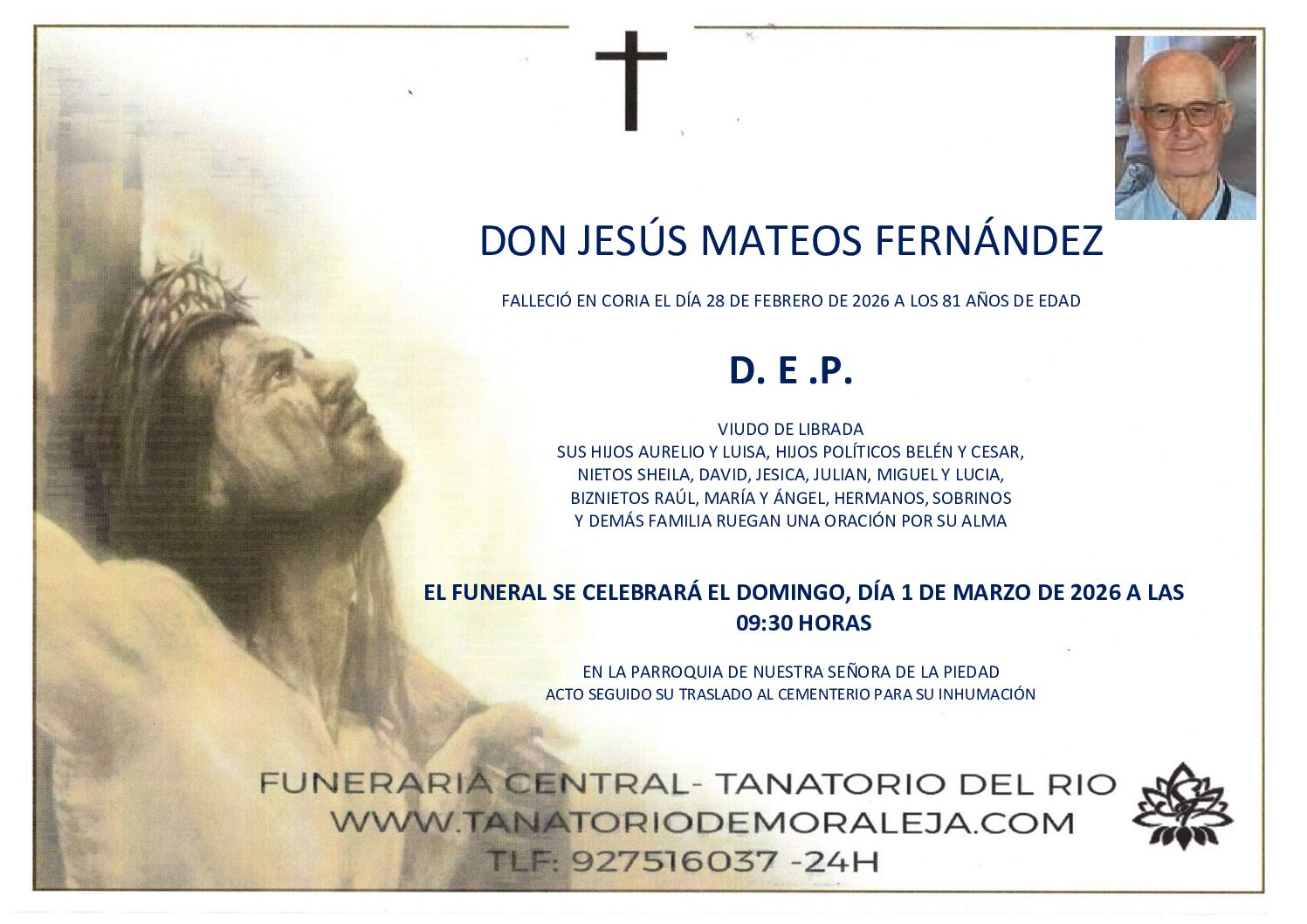 FUNERAL QUE SE CELEBRARÁ EN LA IGLESIA PARROQUIAL NUESTRA SEÑORA DE LA PIEDAD DE MORALEJA